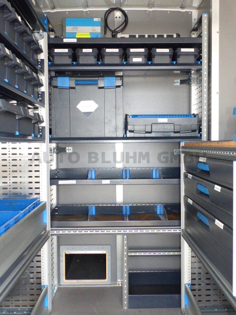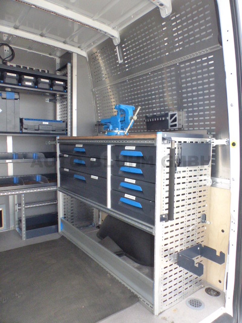 - 3-Werkzeugregale mit Schubladen, Ablagefächer, Schraubstock, Abfallbehälter, Feuerlöscher